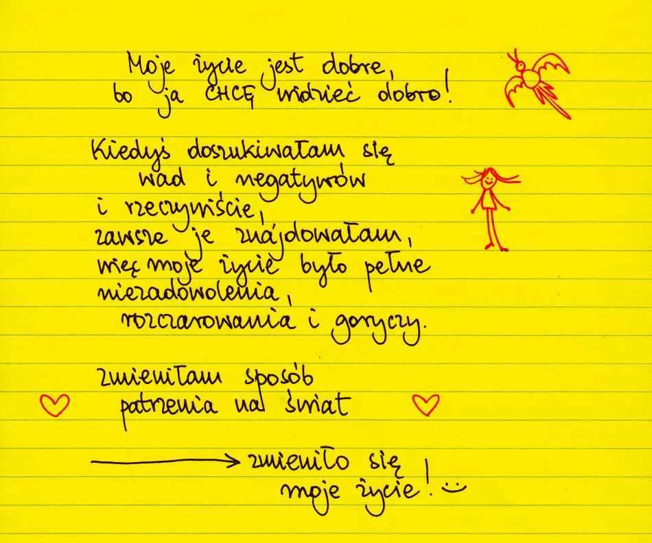 Moje życie jest dobre, bo ja CHCĘ widzieć dobro! Kiedyś doszukiwałam się wad i negatywów i rzeczywiście, zawsze je znajdowałam, więc moje życie było pełne niezadowolenia, rozczarowania i goryczy. Zmieniłam sposób patrzenia na świat – i zmieniło się moje życie! ❤
