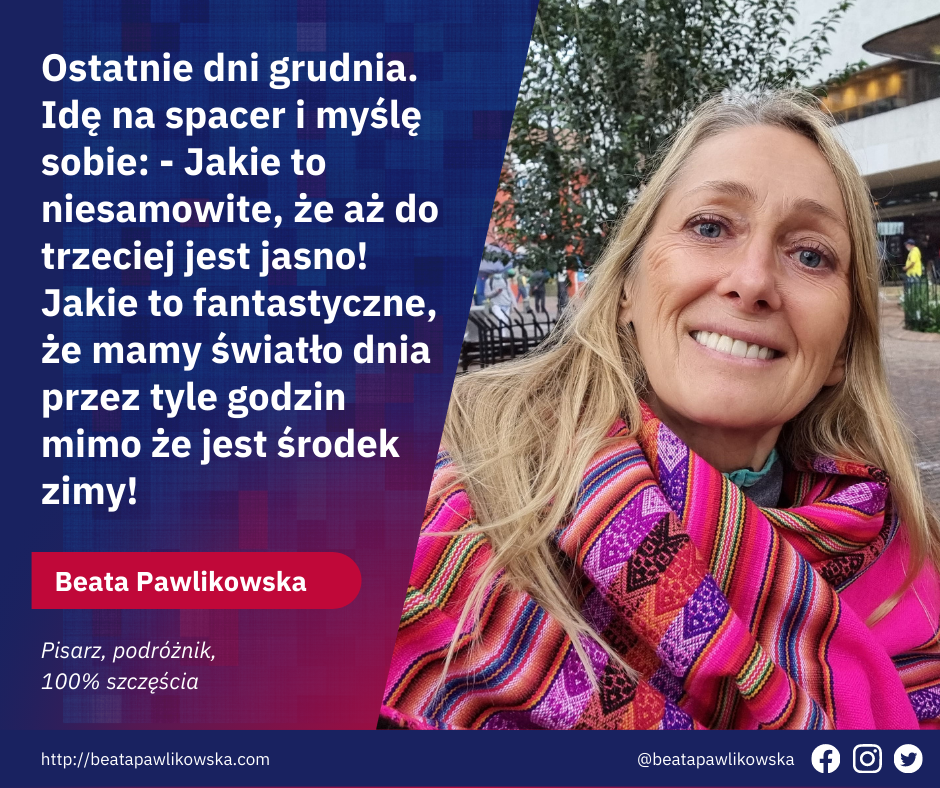 Oto najbardziej niezwykła rzecz. Ostatnie dni grudnia. Słońce wstaje około siódmej rano, zachodzi po trzeciej po południu. Najkrótsze dni w roku. Idę na spacer i myślę sobie: – Jakie to niesamowite, że aż do trzeciej jest jasno! Jakie to fantastyczne, że mamy światło dnia przez tyle godzin mimo że jest środek zimy!