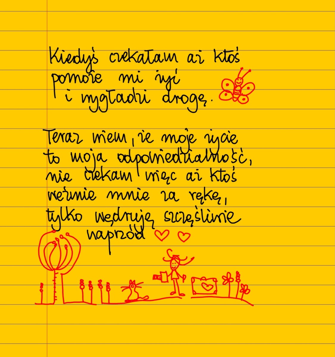 Kiedyś czekałam aż ktoś pomoże mi żyć i wygładzi mi drogę. Teraz wiem, że moje życie to moja odpowiedzialność, nie czekam więc aż ktoś weźmie mnie za rękę, tylko wędruję szczęśliwie naprzód. #żółtakartka