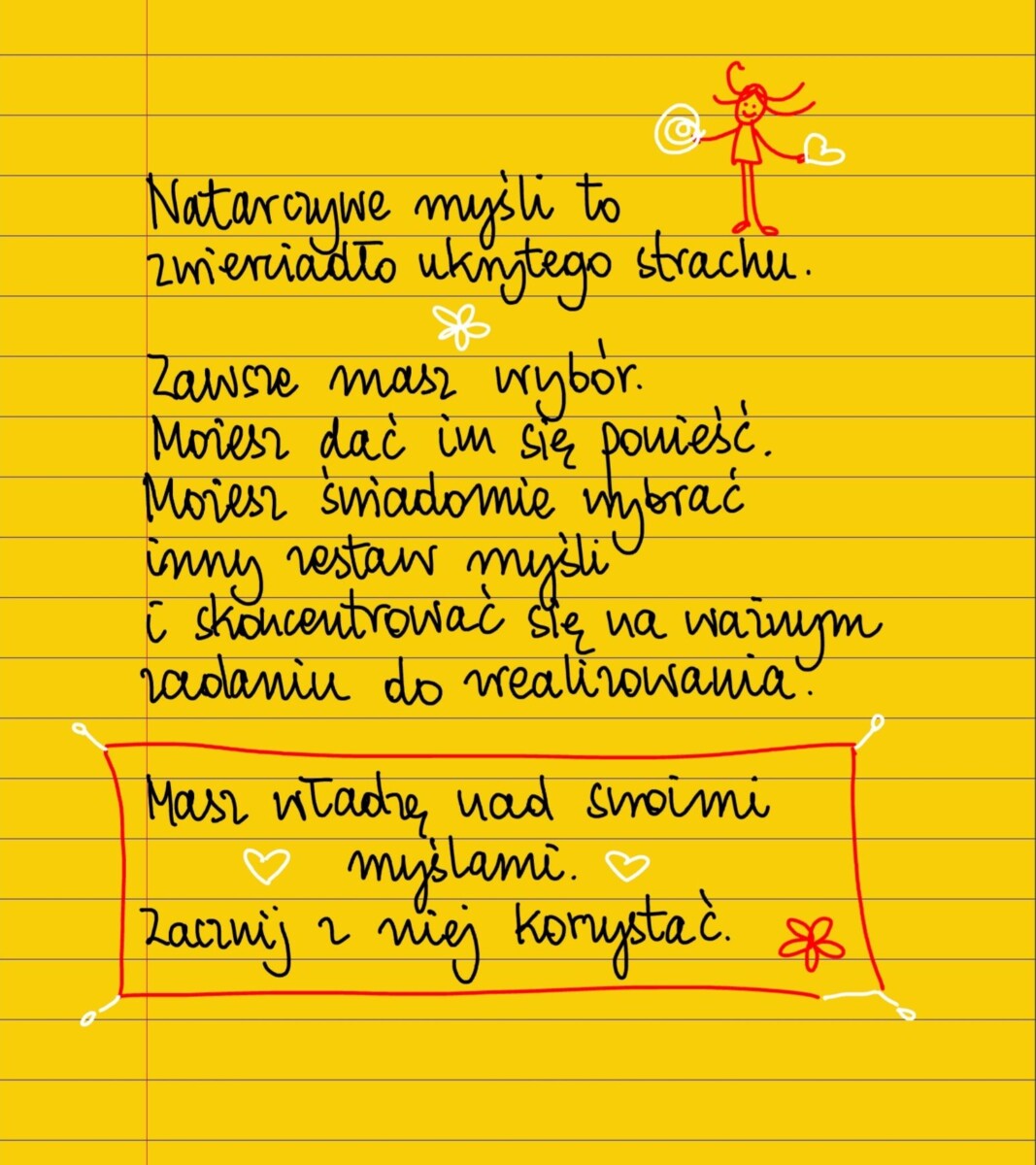 Natarczywe myśli to zwierciadło ukrytego strachu.  Zawsze masz wybór. Możesz dać im się ponieść. Możesz świadomie wybrać inny zestaw myśli i skoncentrować się na ważnym zadaniu do zrealizowania.  Masz władzę nad swoimi myślami. Zacznij z niej korzystać. #żółtakartka