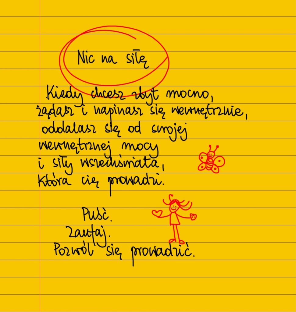 Nic na siłę. Kiedy chcesz zbyt mocno, żądasz i napisz się wewnętrznie, oddalasz się od swojej wewnętrznej mocy i siły wszechświata, która Cię prowadzi. Puść. Zaufaj. Pozwól się prowadzić. ❤ #żółtakartka