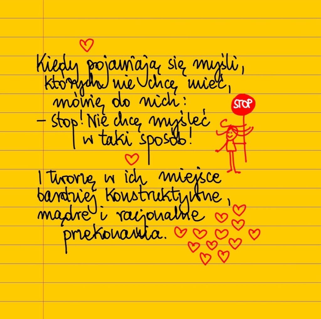 Kiedy pojawiają się myśli, których nie chcę mieć, mówię do nich: Stop. Nie chcę myśleć w taki sposób! I tworzę w ich miejsce bardziej konstruktywne, mądre i racjonalne przekonania. #żółtakartka