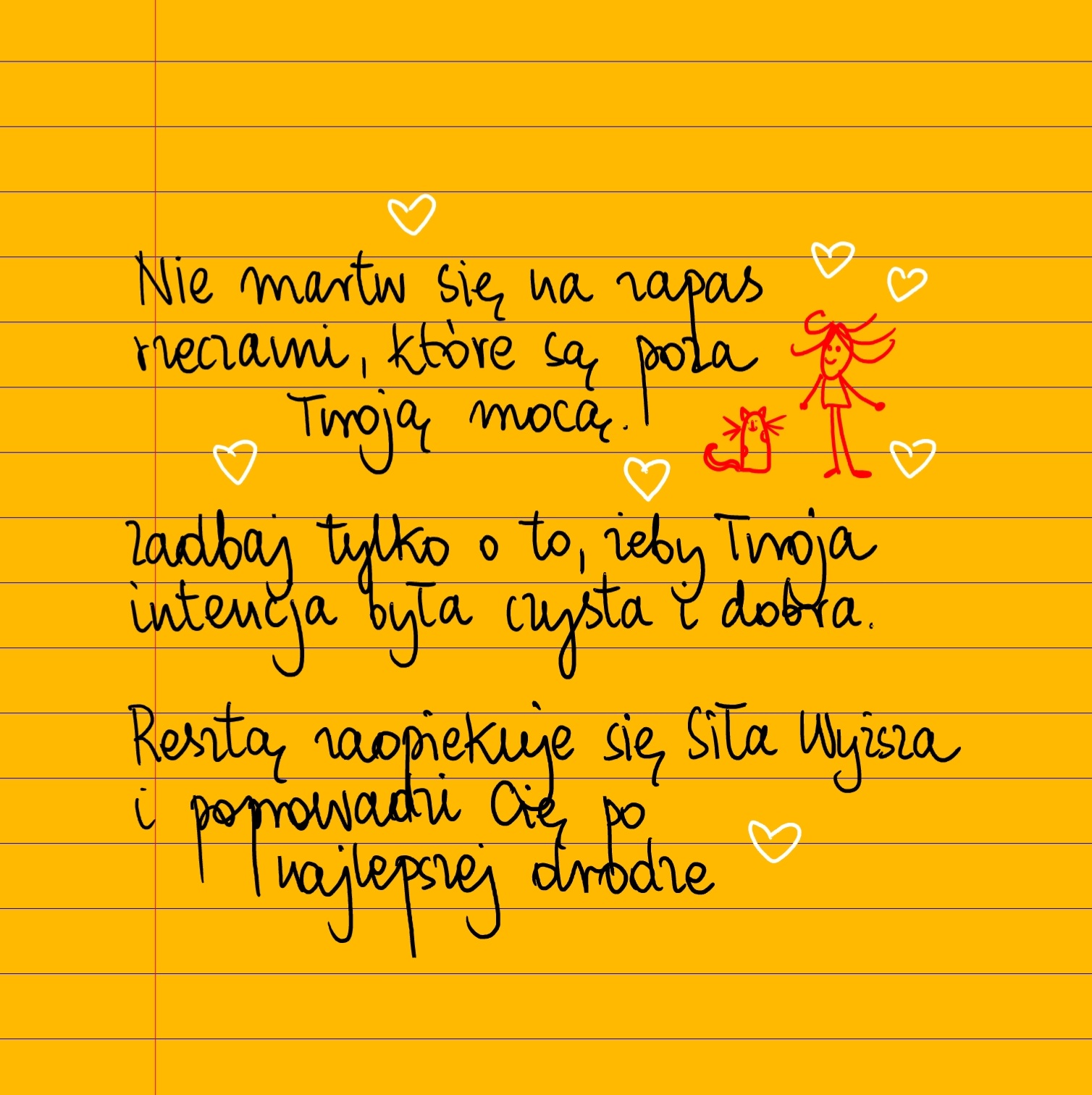 Nie martw się rzeczami, które są poza Twoją mocą. Zadbaj tylko o to, żeby Twoja intencja była czysta i dobra. reszta zaopiekuje się Siła Wyższa i poprowadzi Cię po najlepszej drodze ❤ #żółtakartka #beatapawlikowska