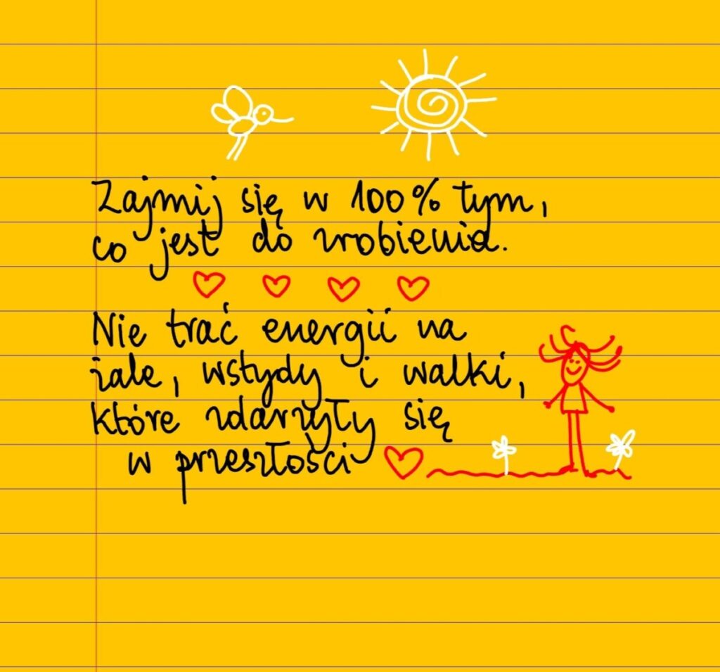 Zajmij się w 100% tym, co jest do zrobienia. Nie trać energii na żale, wstydy i walki, które zdarzyły się w przeszłości. #żółtakartka