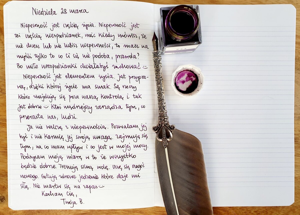 Ja nie walczę z niepewnością. Pozwalam jej być i nie karmię jej swoją uwagą. Zajmuję się tym, na co mam wpływ i co jest w mojej mocy. Podsycam moją wiarę w to, że wszystko będzie dobrze. Trenuję silną wolę. Uczę się czegoś nowego. Gotuję zdrowe jedzenie, które daje mi siłę. Nie martw się na zapas 😊
