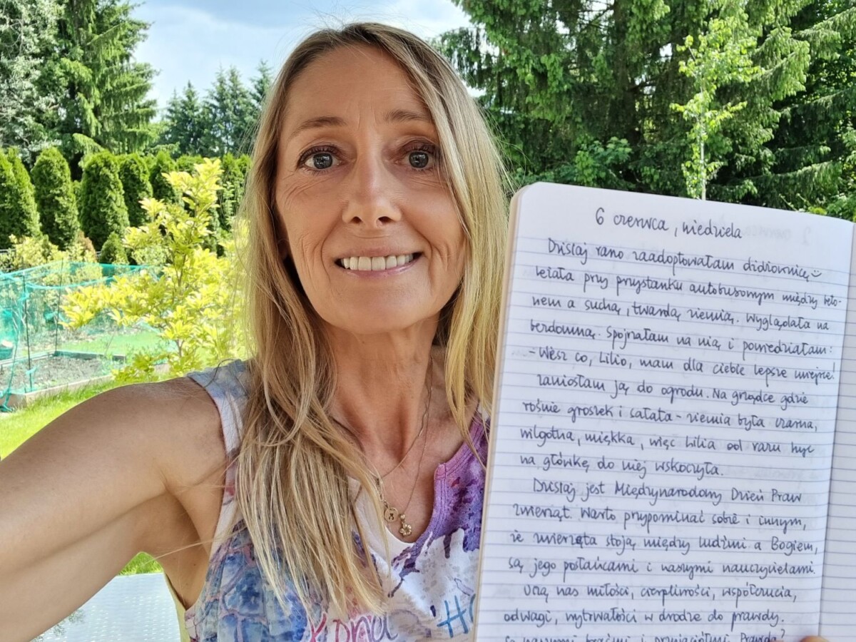 Zaniosłam ją do ogrodu. Na grządce, gdzie rośnie groszek i sałata – ziemia była czarna, wilgotna, miękka, więc Lilia od razu hyc na główkę do niej wskoczyła.