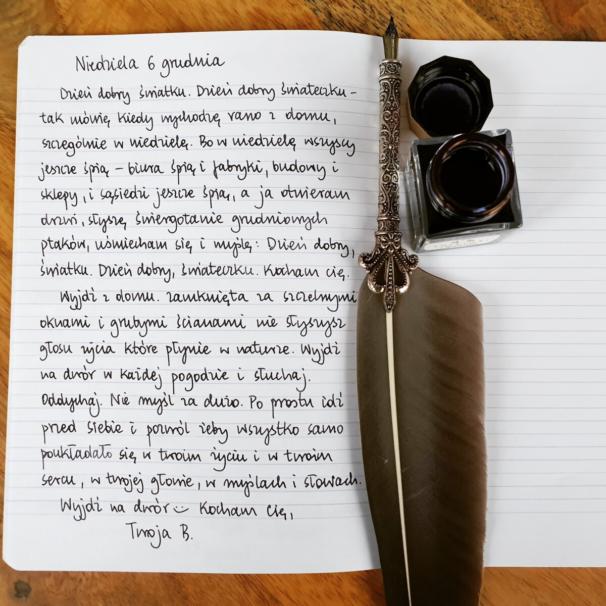 Dzień dobry, światku. Dzień dobry, świateczku – tak mówię kiedy wychodzę rano z domu, szczególnie w niedzielę. Bo w niedzielę wszyscy jeszcze śpią – biura śpią i fabryki, budowy i sklepy, i sąsiedzi jeszcze śpią, a ja otwieram drzwi, słyszę świergotanie grudniowych ptaków, uśmiecham się i myślę: Dzień dobry, światku. Dzień dobry, świateczku. Kocham cię.