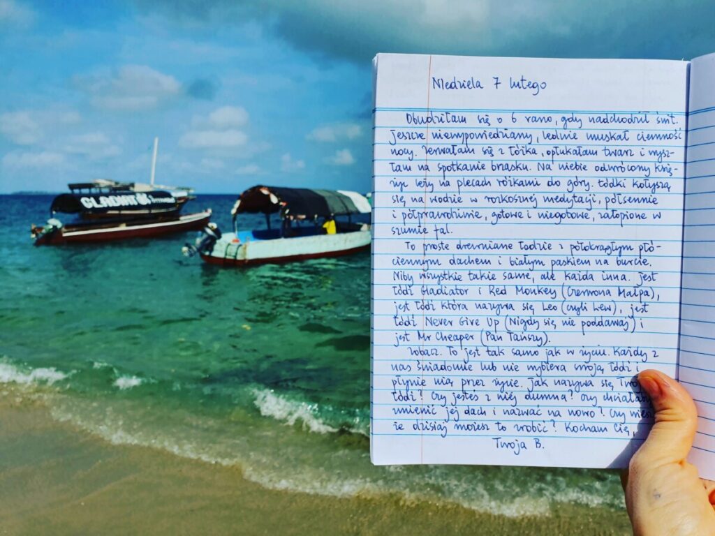 Obudziłam się o 6 rano, gdy nadchodził świt. Jeszcze niewypowiedziany, ledwie muskał ciemność nocy. Zerwałam się z łóżka, opłukałam twarz i wyszłam na spotkanie brzasku. Na niebie odwrócony księżyc leży na plecach różkami do góry. Łódki kołyszą się na wodzie w rozkosznej medytacji, półsennie i półprawdziwie, gotowe i niegotowe, zatopione w szumie fal.