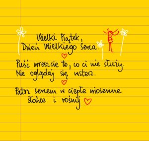 Wszystko, co potrzebujesz zrobić, żeby podczas tych świąt odmienić swoje życie, to dopuścić do siebie cud wiosny. Otwórz serce i umysł na cuda wiosennej przemiany, które dokonują się w naturze. Codziennie wyjdź na spacer, słuchaj swoich kroków i śpiewu ptaków, patrz w niebo, znajdź maleńkie pierwsze delikatne kwiatki na jabłoni i zielone listeczki na wierzbach. Wypatrz w trawie fiołkowe kwiatki bluszczyka kurdybanka i jego waniliowej koleżanki, jasnoty białej. Oddychaj głęboko, powoli, smakuj powietrze, wystaw twarz do ciepłego słońca. Otwórz swoje serca, oddaj się wiośnie, nadziei, radości i wzrastaniu. Tylko tyle i aż tyle. To wszystko zmieni. Staniesz się szczęśliwą piosenką kosa, szmaragdową trawą i błękitem nieba, złotym tulipanem, życiem i Nowym Początkiem, którego tak pragnąłeś ❤
