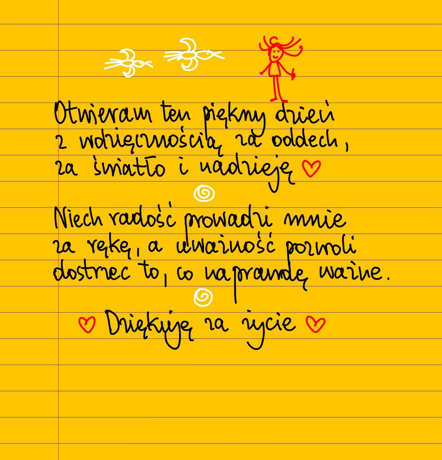 Otwieram ten piękny dzień z wdzięcznością za oddech, za światło i nadzieję 🌞 Niech radość dzisiaj prowadzi mnie za rękę, a uważność pozwoli dostrzec to, co naprawdę ważne. Dziękuję za ten moment. Dziękuję za życie. 💛