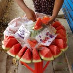 Plastry dojrzałego, słodkiego arbuza sprzedawane na dworcu kolejowym w Birmie.