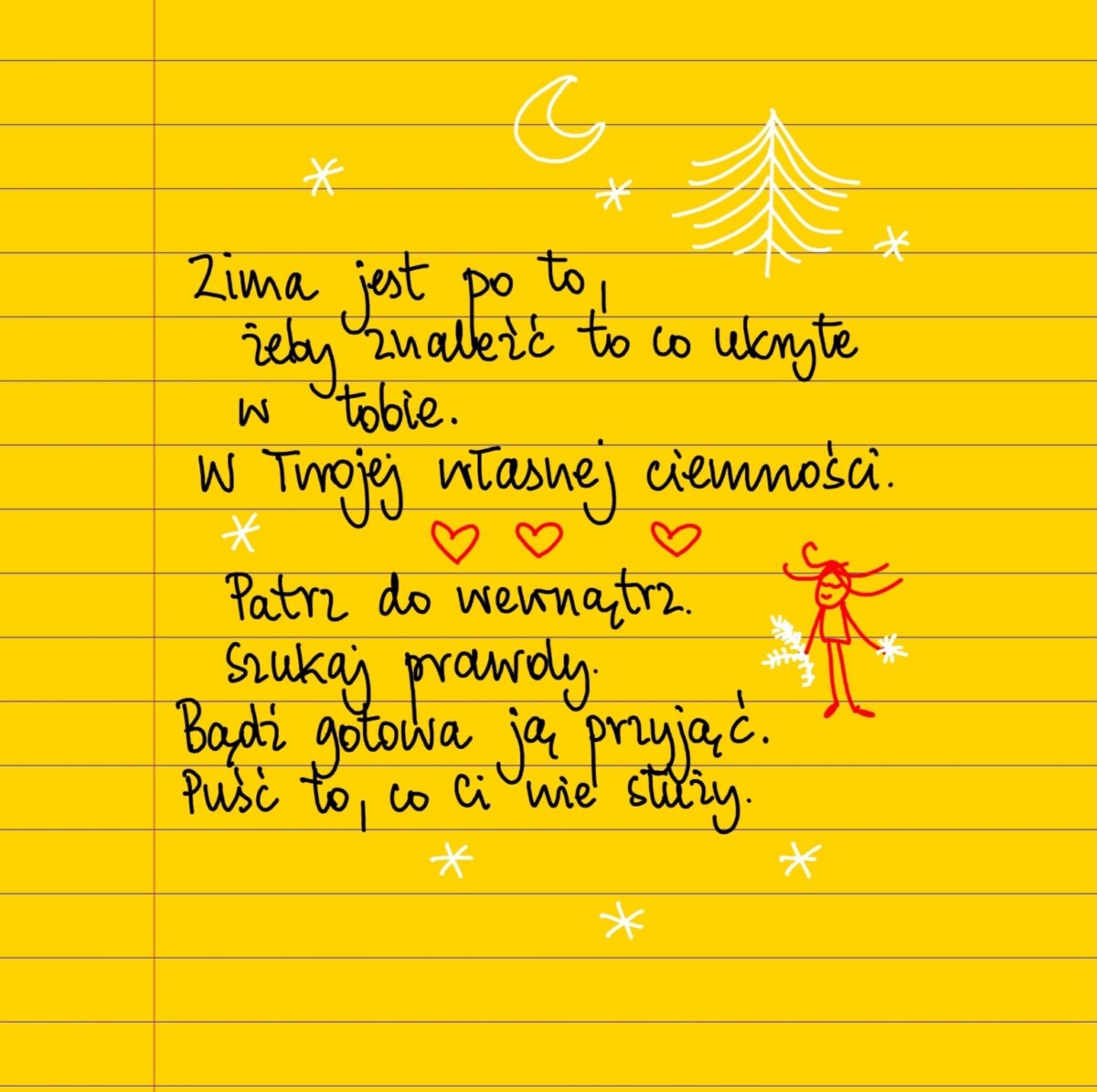Zima jest po to, żeby znaleźć to co ukryte w tobie. W twojej własnej ciemności. Patrz do wewnątrz. Szukaj prawdy. Bądź gotowa ją przyjąć. Puść to co Ci nie służy. #żółtakartka