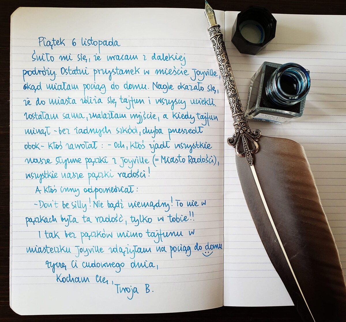 Śniło mi się, że wracam z dalekiej podróży. Ostatni przystanek w mieście Joyville, skąd miałam pociąg do domu. Nagle okazało się, że do miasta zbliża się tajfun i wszyscy uciekli. Zostałam sama, znalazłam wyjście, a kiedy tajfun minął – bez żadnych szkód, pewnie przeszedł obok – ktoś zawołał: