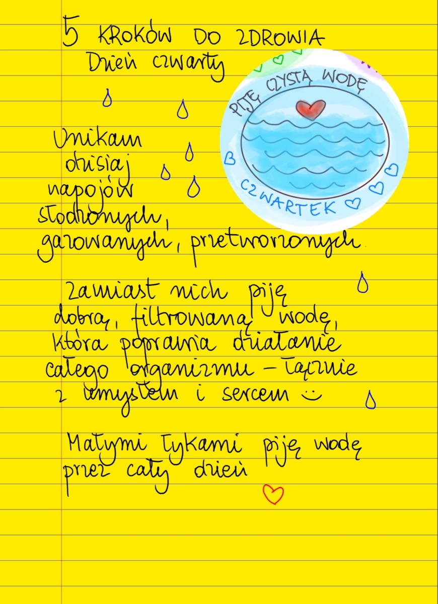 Na jeden dzień w tygodniu zrezygnuj z napojów gazowanych, słodzonych i fabrycznie przetworzonych (czyli sprzedawanych jako gotowe w butelkach i kartonach). Zamiast nich pij wodę (najlepiej filtrowaną). Zobaczysz, że picie wody dodaje energii lepiej, szybciej i na dłużej niż jakikolwiek „napój energetyczny”. Woda pomaga lepiej przyswajać wartości odżywcze z pożywienia, pomaga dotlenić wszystkie zakątki ciała, wzmacnia skórę, usprawnia trawienie, dodaje energii i dobrego samopoczucia. Pij wodę małymi łykami przez cały dzień.