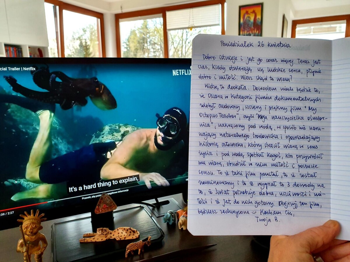 Widzę to dookoła. Dowodem niech będzie to, że Oscara w kategorii filmów dokumentalnych zdobył cudowny, szczery i piękny film „My Octopus Teacher”, czyli „Moja nauczycielka ośmiornica”, nakręcony pod wodą w sposób nie naruszający naturalnego środowiska i opowiadający historię człowieka, który stracił wiarę w sens życia i pod wodą spotkał kogoś, kto przywrócił mu wiarę, obudził w nim miłość i poczucie sensu. To że taki film powstał, to że został nominowany i to, że wygrał to trzy dowody na to, że świat potrzebuje dobra, uczciwości i miłości i że jest do nich gotowy. Obejrzyj ten film, będziesz zachwycona 😊 Kocham Cię,