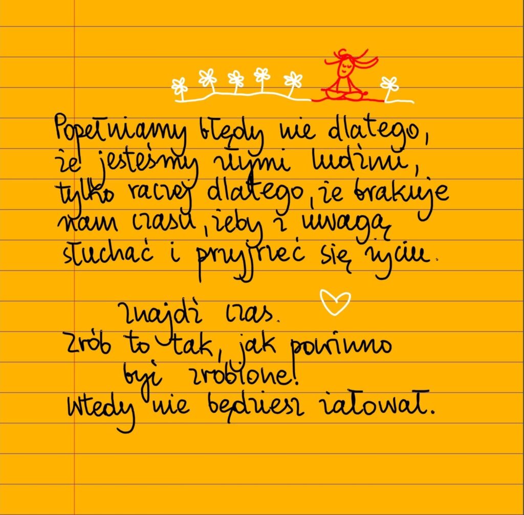 Popełniamy błędy nie dlatego, że jesteśmy złymi ludźmi, tylko raczej dlatego, że brakuje nam czasu, żeby wysłuchać drugiego człowieka albo świadomie przyjrzeć się sytuacji, żeby podjąć najlepsze kroki. Znajdź czas. Zrób to tak, jak powinno być zrobione. Wtedy nie będziesz żałował.