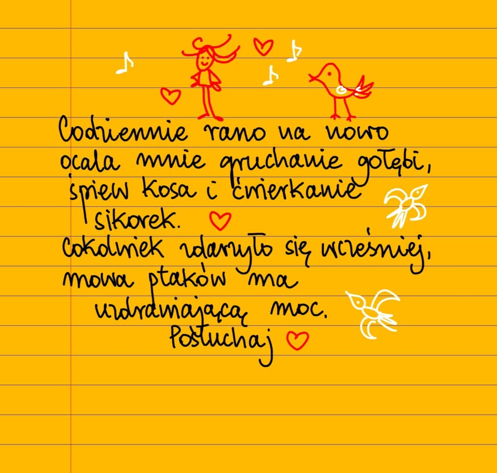 Codziennie rano na nowo ocala mnie gruchanie gołębi, śpiew kosa i ćwierkanie sikorek. Cokolwiek zdarzyło się wcześniej, mowa ptaków ma uzdrawiającą moc. Posłuchaj ❤