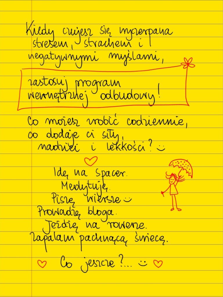 Kiedy czujesz się wyczerpana/wyczerpany stresem, strachem i negatywnymi myślami, zastosuj program wewnętrznej odbudowy! Co możesz zrobić codziennie, co dodaje Ci siły, lekkości i nadziei? Ide na spacer. Medytuję. Pisze wiersze. Prowadzę bloga. Jeżdżę na rowerze. Zapalam pachnące świece. Co jeszcze? #żółtakartka