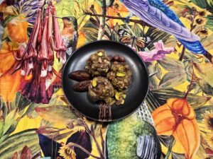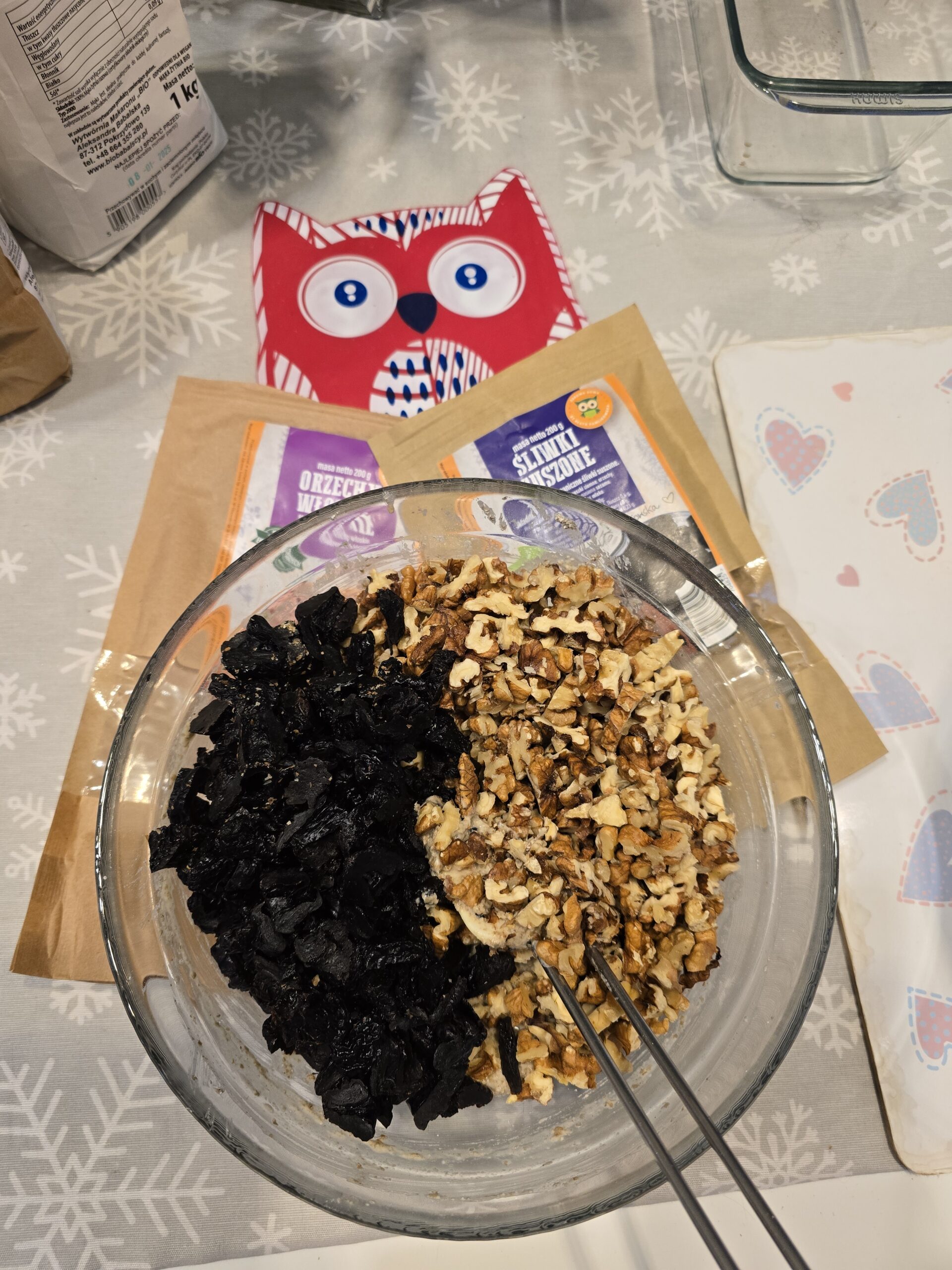 Dodaj sól, czarnuszkę, pokrojone orzechy i śliwki, wymieszaj. Jeśli trzeba, dodaj trochę wody. Ciasto powinno mieć konsystencję miękką, wilgotną.
