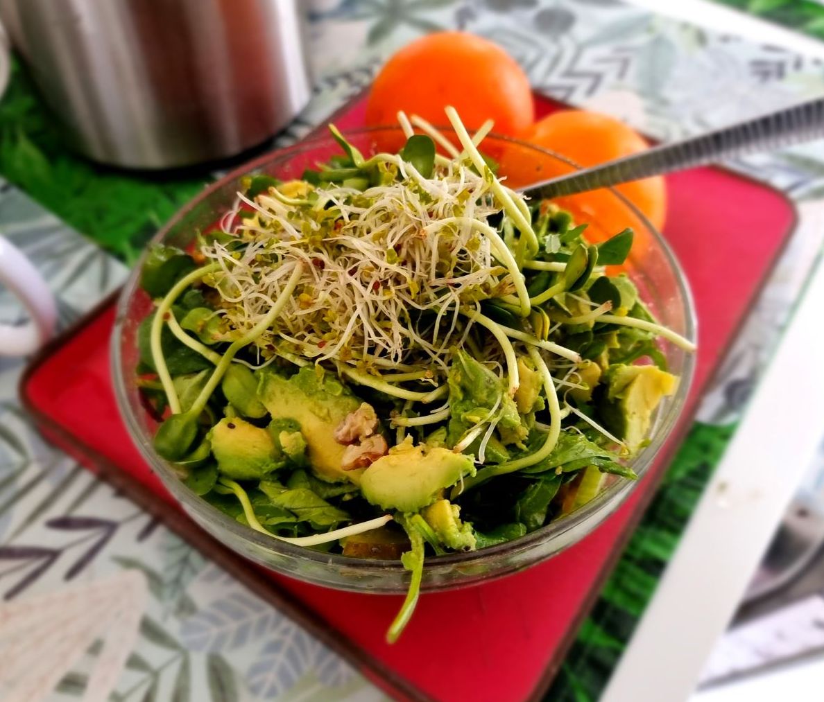Od kilku miesięcy to jest moje ulubione danie na śniadanie. Ma mnóstwo błonnika, witamin, minerałów, zdrowych tłuszczy potrzebnych do pracy mózgu i wszystkich komórek, cudownie smakuje i syci na kilka godzin. Nie zamieniłabym tej wspaniałej sałaty na żadne rogaliki ani słodycze!!
