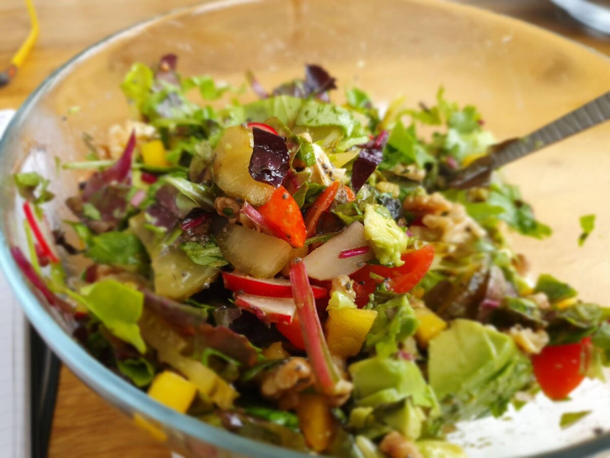 • 2 garści różnych młodych listków i sałat (szpinak, botwinka, sałata dębowa, sałata masłowa, karbowana, rukola)