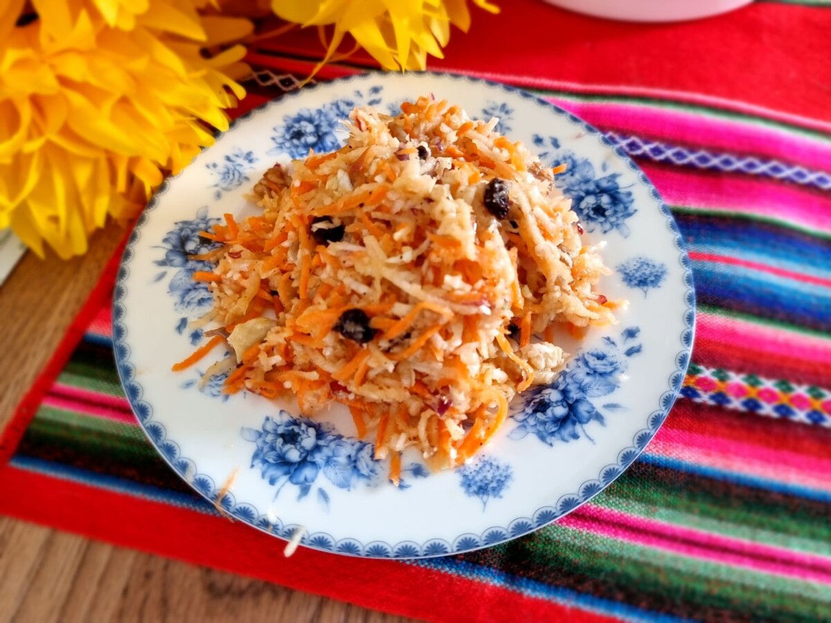 Wymyśliłam ją wczoraj, zrobiłam i okazała się pyszna! Potrzebny będzie kawałek białej kapusty, słodkie, soczyste jabłko, marchewka, czerwona cebula i garść rodzynek. Taka surówka świetnie pasuje do obiadu i może być równie dobrze samodzielnym daniem na lekki lunch albo kolację.