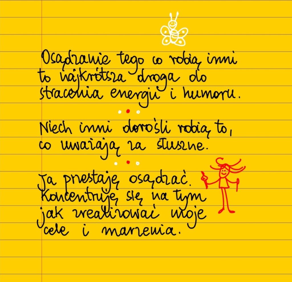 Osądzanie tego co robią inni to najkrótsza droga do stracenia energii, czasu i dobrego humoru. Niech inni dorośli robią to, co uważają dla siebie za najlepsze. Ja przestaję ich krytykować i osądzać. Koncentruję się na tym jak zrealizować mój życiowy cel. #żółtakartka