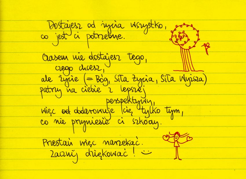 Dostajesz od życia wszystko, co jest ci potrzebne. Czasem nie dostajesz tego, czego chcesz, ale Życie (czyli Bóg, Siła Życia, Siła Wyższa) patrzy na ciebie z lepszej perspektywy, więc obdarowuje cię tylko tym, co nie przyniesie ci szkody. Przestań więc narzekać. Zacznij dziękować ❤