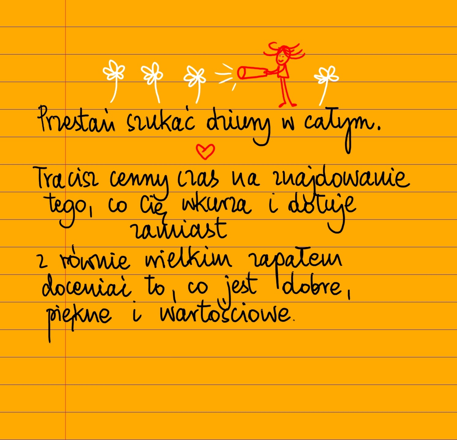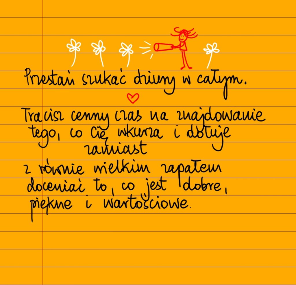 Przestań szukać dziury w całym. Tracisz cenny czas na znajdowanie tego, co Cię wkurza i dołuje zamiast z równie wielkim zapałem doceniać to, co jest dobre, piękne i wartościowe ❤ #beatapawlikowska #żółtakartka