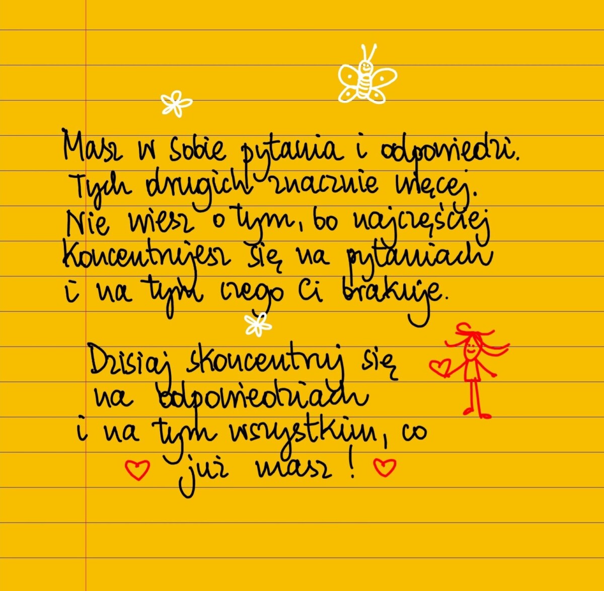 Masz w sobie pytania i odpowiedzi. Tych drugich znacznie więcej. Nie wiesz o tym, bo najczęściej koncentrujesz się na pytaniach i na tym, czego Ci brakuje. Dzisiaj skoncentruj się na odpowiedziach i na tym, co już masz!! #żółtakartka
