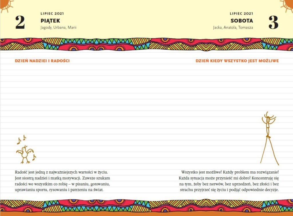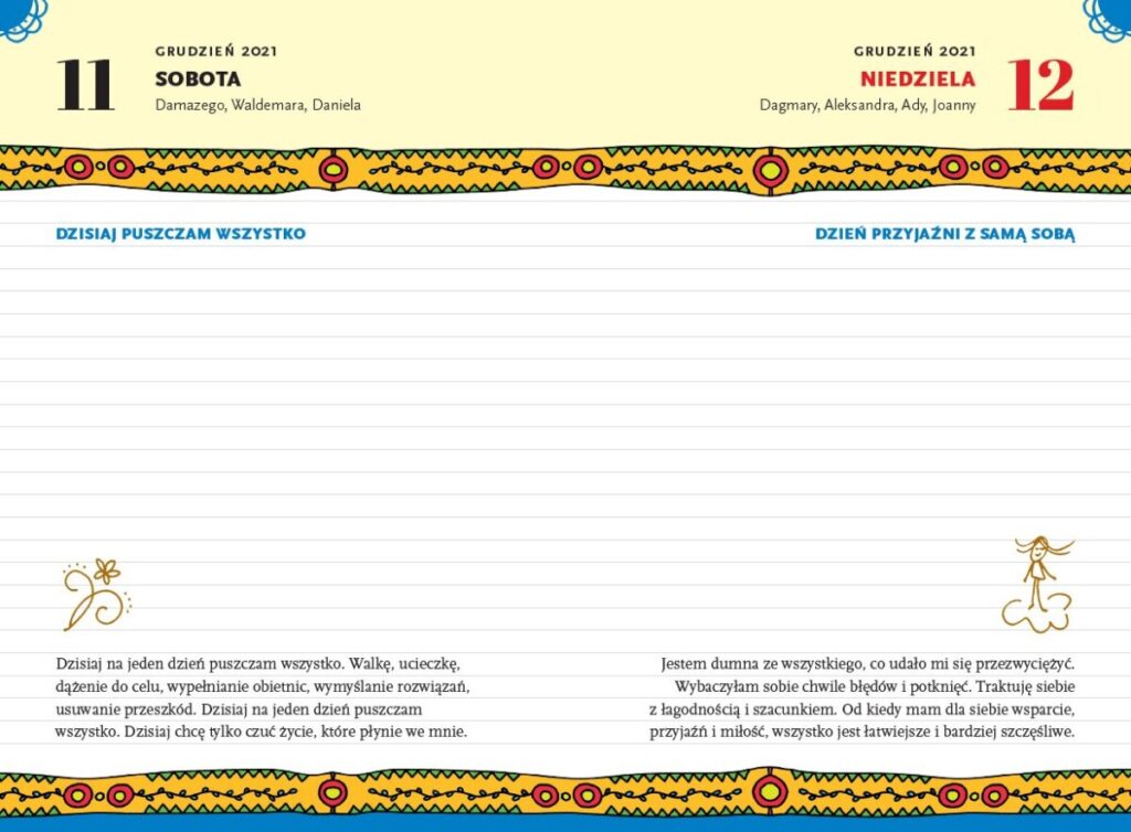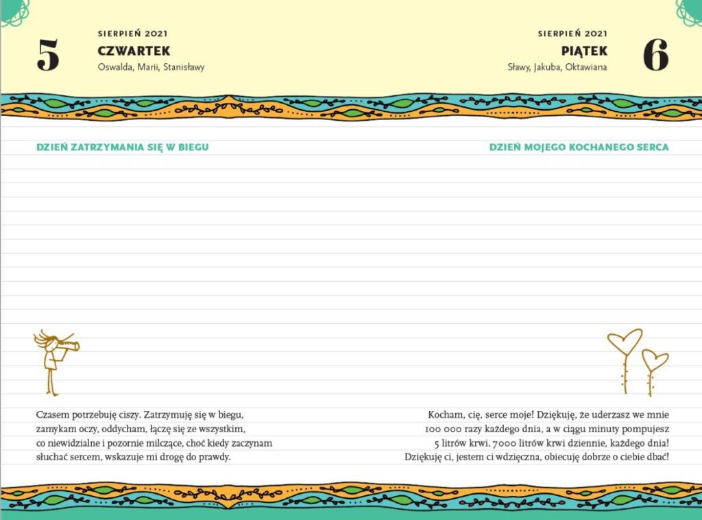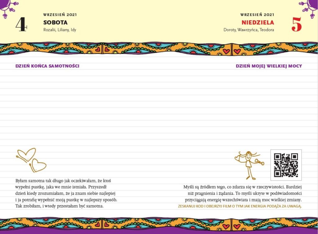 W tym roku w kalendarzu jest jeszcze bardziej kolorowo 🙂 Jak zwykle znajdziesz w nim motywujące teksty na każdy dzień roku, rysunki, linki do filmów i przepisy kulinarne, a także strony na własne notatki. Oto jak kalendarz wygląda w środku: