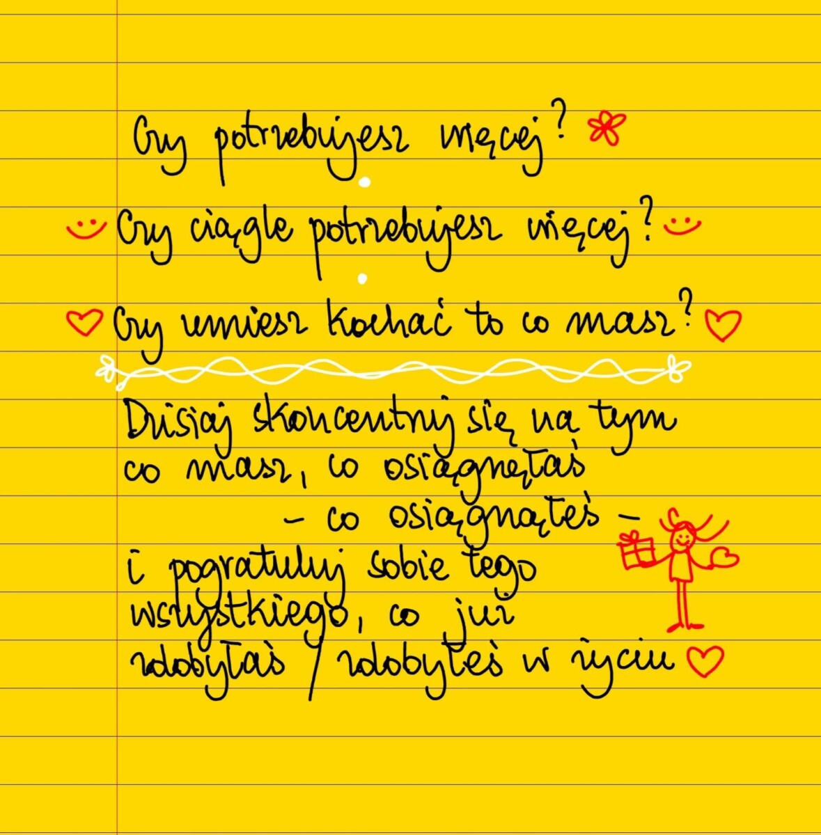Czy potrzebujesz więcej? Czy ciągle potrzebujesz więcej? Czy umiesz kochać to co masz? Dzisiaj skoncentruj się na tym co masz, co osiągnęłaś/ osiągnąłeś, i pogratuluj sobie tego wszystkiego co już zdobyłaś/zdobyłeś w życiu. #żółtakartka