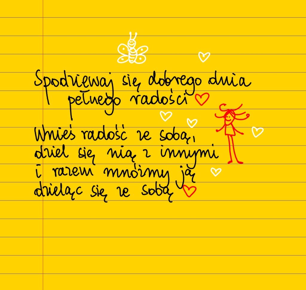 Spodziewaj się dobrego dnia pełnego radości. Wnieś radość ze sobą, dziel się nią z innymi i razem mnóżmy ją dzieląc się ze sobą ❤ #żółtakartka #beatapawlikowska