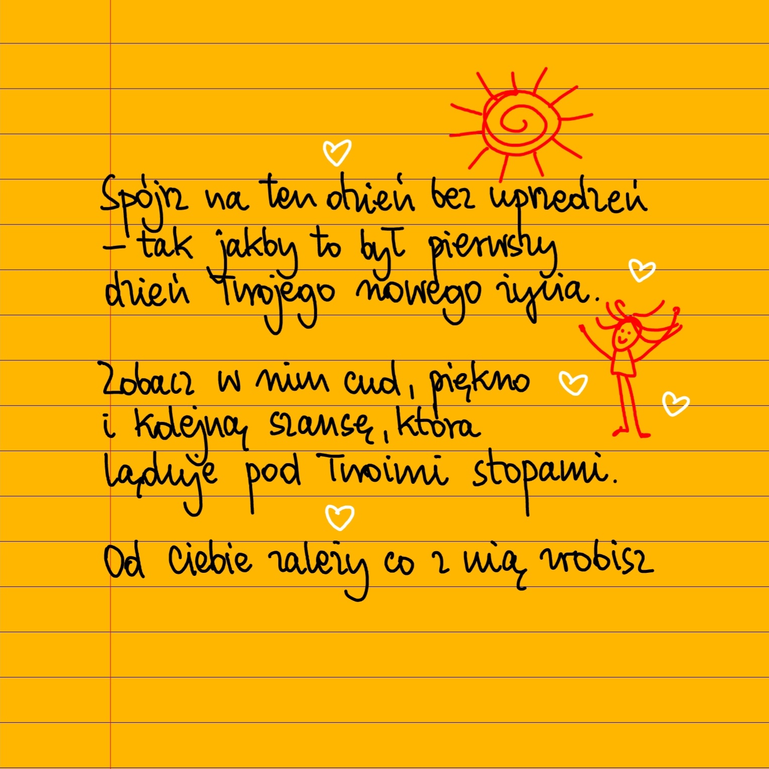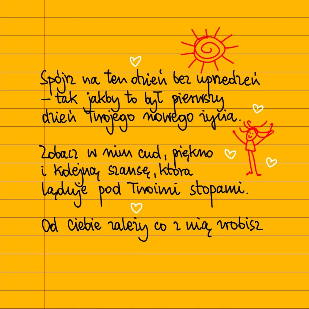 Spójrz na ten dzień bez uprzedzeń, tak jakby to był pierwszy dzień twojego nowego życia. Zobacz w nim cud, piękno i kolejną szansę, która ląduje pod twoimi stopami. Od ciebie zależy co z nią zrobisz ❤
