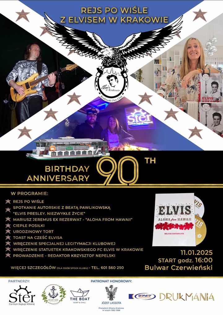 Serdecznie zapraszam na 90. urodziny Elvisa Presleya, które odbędą się w sobotę 11 stycznia 2025 r. w Krakowie. To są urodziny organizowane przez Krakowski Fanklub Elvisa Presleya podczas rejsu statkiem po Wiśle. W programie m.in. koncert Aloha From Hawaii w wykonaniu Mariusza Jaremusa (z zespołu Rezerwat), tort i toast urodzinowy, spotkanie autorskie z nową biografią „Elvis Presley. Niezwykłe życie”. W sprawie wejściówek prosimy o kontakt pod nr 601-560-250 (Wiślany Ogród, Statek Sobieski). Do zobaczenia!