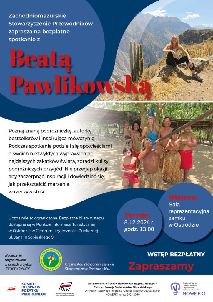 Spotkanie podróżnicze w sali reprezentacyjnej zamku w Ostródzie (ul. Adama Mickiewicza 22, 14-100 Ostróda). Spotkanie jest bezpłatne, liczba miejsc ograniczona. Uwaga: Bilety na wydarzenie można odebrać jedynie osobiście w Punkcie Informacji Turystycznej w Ostródzie (ul. Jana III Sobieskiego 9). Dla osób spoza Ostródy mam 10 specjalnych biletów – proszę o kontakt na beata@beatapawlikowska.com