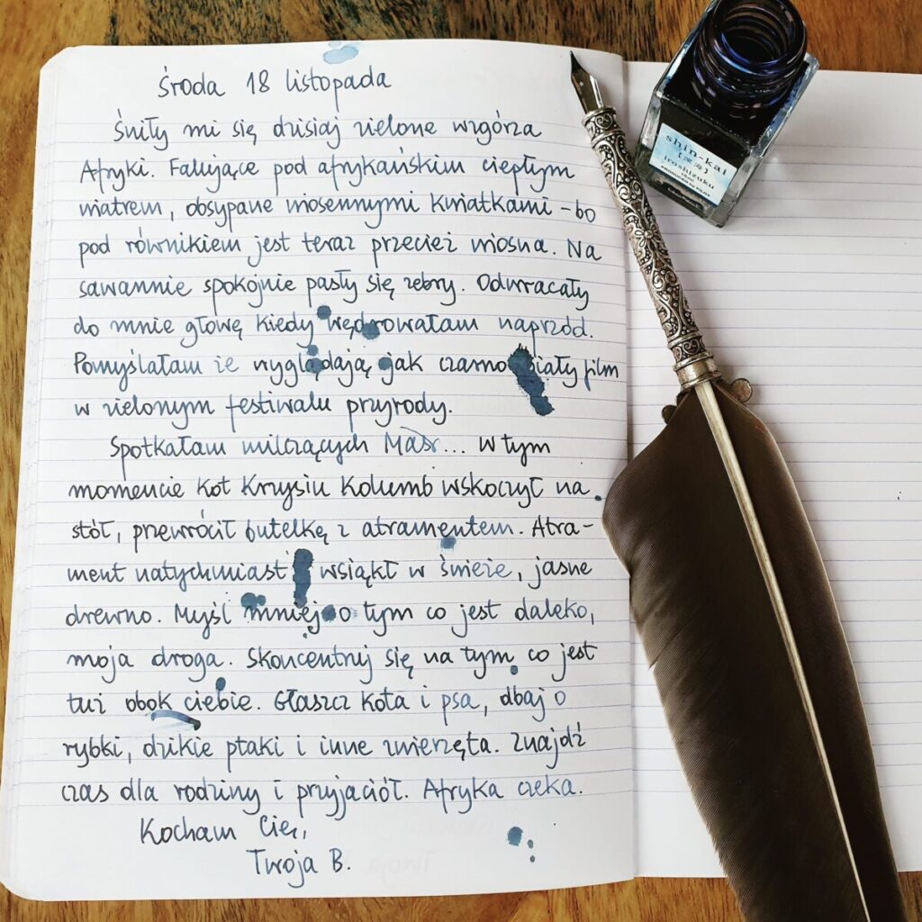 Spotkałam milczących Mas… W tym momencie kot Krzysiu Kolumb wskoczył na stół, przewrócił butelkę z atramentem. Atrament natychmiast wsiąkł w świeże, jasne drewno. Myśl mniej o tym co jest daleko, moja droga. Skoncentruj się na tym, co jest tuż obok Ciebie. Głaszcz kot i psa, dbaj o rybki, dzikie ptaki i inne zwierzęta. Znajdź czas dla rodziny i przyjaciół. Afryka czeka.