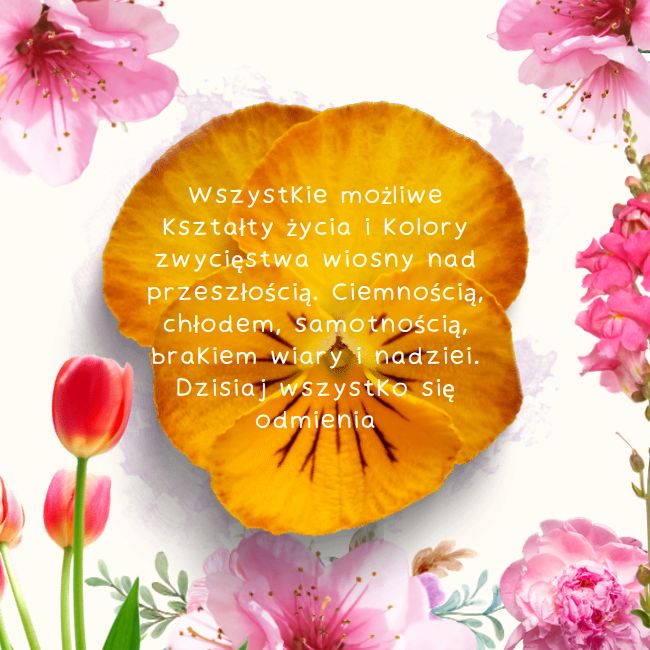 Świat jak z bajki. Drzewa wiśniowe obsypane różowym i kwiatkami. Jabłonie w białych ślubnych sukniach. Tulipany o strzępiastych płatkach jak tropikalne papugi. Smagłe, dumne, wysokie źdźbła młodej trawy. Kępy kosmatych fioletowych kwiatków przy drodze. Błękitne niezapominajki. Żółte mlecze przyczajone przy ziemi, tak jakby za chwilę miały wzbić się w powietrze i odlecieć. Rozmarzone motyle. Buczące bąki. Niespodziewanie gorące słońce. Białe obłoki. Zielone pączki oszałamiająco pachnącego bzu, który lada dzień rozkwitnie. Rozkołysane gałązki wierzb. Wszystkie możliwe kształty życia i kolory zwycięstwa wiosny nad przeszłością. Ciemnością, chłodem, samotnością, brakiem wiary i nadziei. Dzisiaj wszystko się odmienia. Witaj w domu, kochany maju!!!!