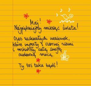 Świat jak z bajki. Drzewa wiśniowe obsypane różowym i kwiatkami. Jabłonie w białych ślubnych sukniach. Tulipany o strzępiastych płatkach jak tropikalne papugi. Smagłe, dumne, wysokie źdźbła młodej trawy. Kępy kosmatych fioletowych kwiatków przy drodze. Błękitne niezapominajki. Żółte mlecze przyczajone przy ziemi, tak jakby za chwilę miały wzbić się w powietrze i odlecieć. Rozmarzone motyle. Buczące bąki. Niespodziewanie gorące słońce. Białe obłoki. Zielone pączki oszałamiająco pachnącego bzu, który lada dzień rozkwitnie. Rozkołysane gałązki wierzb. Wszystkie możliwe kształty życia i kolory zwycięstwa wiosny nad przeszłością. Ciemnością, chłodem, samotnością, brakiem wiary i nadziei. Dzisiaj wszystko się odmienia. Witaj w domu, kochany maju!!!!