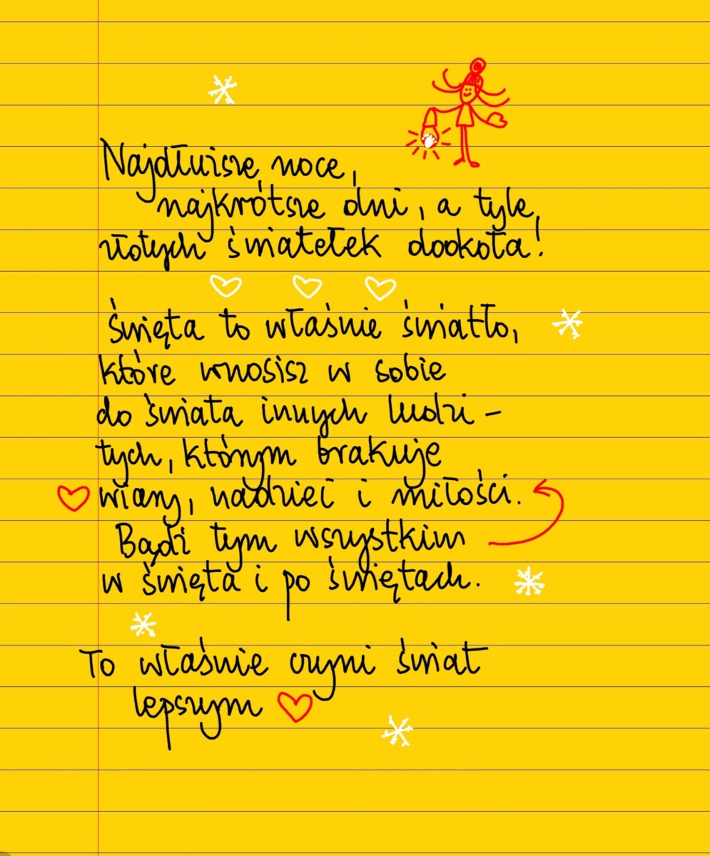 Najdłuższe noce, najkrótsze dni, a tyle złotych światełek dookoła. Święta to właśnie światło, które wnosisz w sobie do życia innych ludzi – tych, którym brakuje wiary, nadziei i miłości. Bądź tym wszystkim w święta i po świętach. To właśnie czyni świat lepszym. #żółtakartka