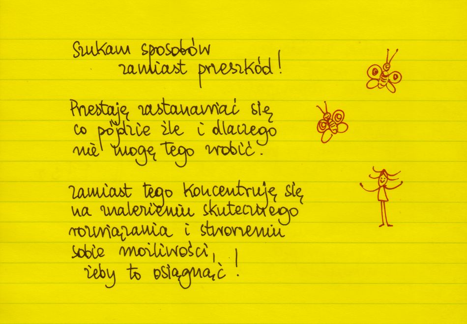Szukam sposobów zamiast przeszkod! przestaję zastanawiać się co pójdzie źle i dlaczego nie moge tego zrobić. Zamiast tego koncentruję się na znalezieniu skutecznego rozwiązania i stworzeniu sobie możliwości, żeby to osiągnąć! #żółtakartka