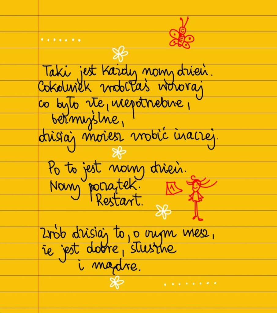 Taki jest każdy nowy dzień. Cokolwiek zrobiłaś wczoraj, co było złe, niepotrzebne, bezmyślne, dzisiaj możesz zrobić inaczej. Po to jest nowy dzień. Nowa szansa. Nowy początek. Restart. Zrób dzisiaj to, o czym wiesz, że jest dobre, słuszne i mądre. #żółtakartka