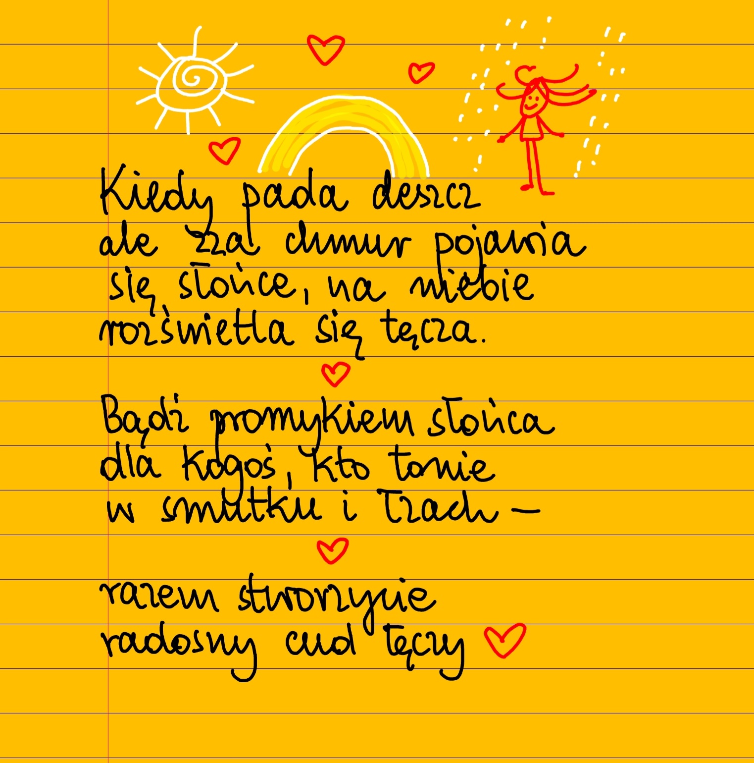 Kiedy pada deszcz ale niespodziewanie zza chmur pojawia się słońca, na niebie rozświetla się tęcza. Bądź promykiem słońca dla kogoś, kto tonie w smutku i łzach, a razem stworzycie radosny cud tęczy. #żółtakartka