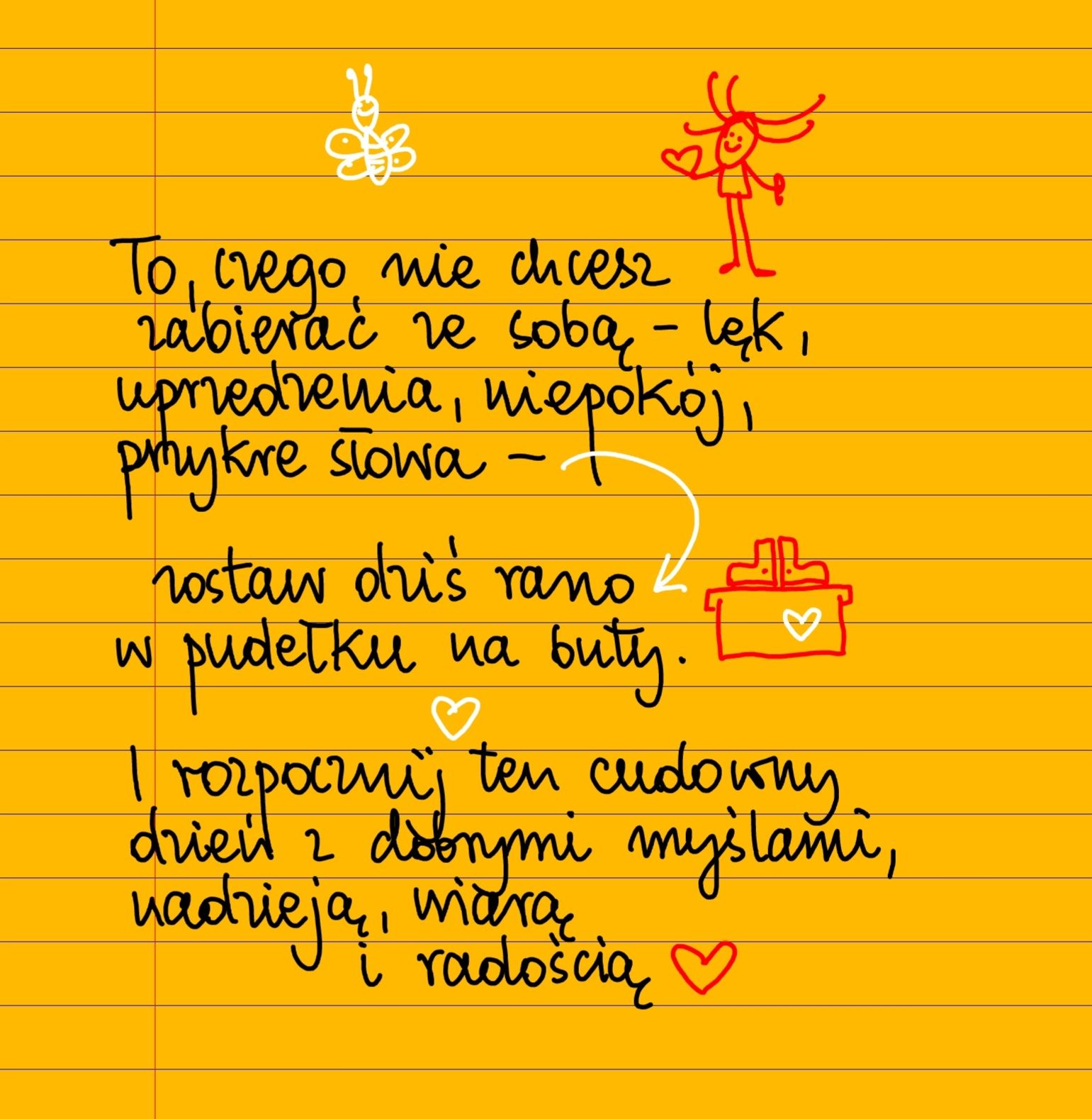 To czego nie chcesz zabierać ze sobą – lęk, uprzedzenia, niepokój, złe słowa, przykre wspomnienia – zostaw dziś rano w pudełku na buty. Jeśli będziesz chciała do nich wrócić, zrób to dopiero wieczorem. A teraz rozpocznij ten cudowny dzień z dobrymi myślami, nadzieją, wiarą i uśmiechem. #żółtakartka