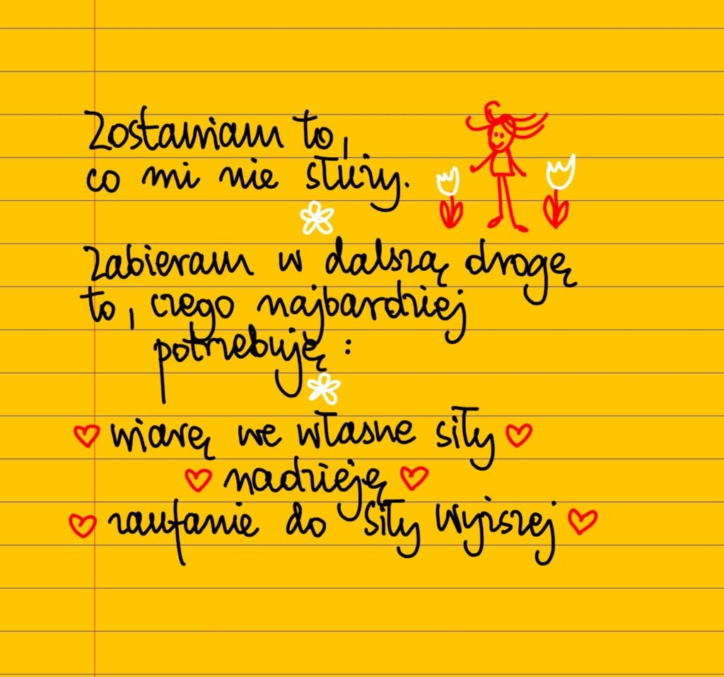 Zostawiam to, co mi nie służy. Zabieram w dalszą drogę to, czego najbardziej potrzebuję: wiarę we własne siły, nadzieję i zaufanie do Siły Wyższej. #żółtakartka