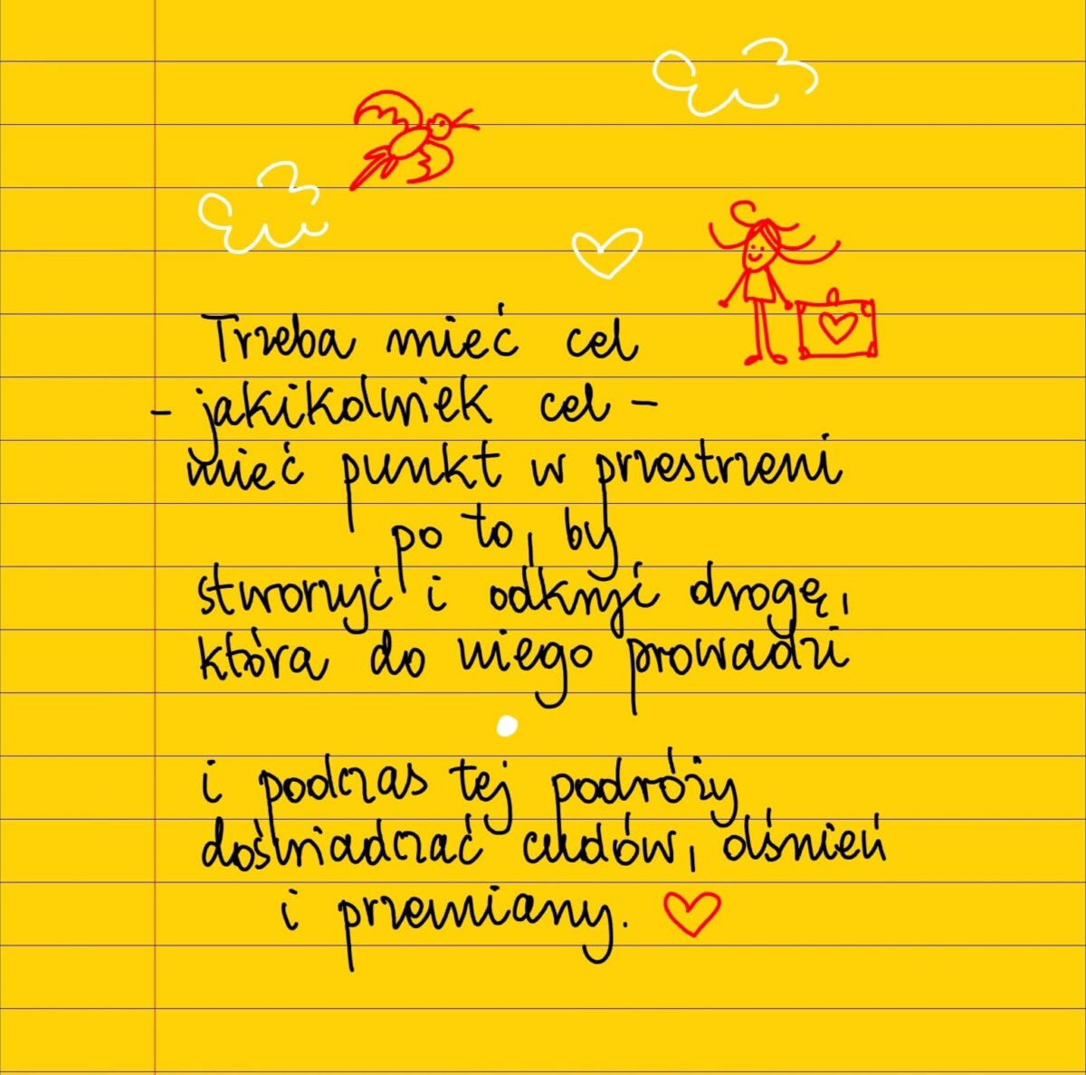 Trzeba mieć cel – jakikolwiek cel, punkt w przestrzeni, by stworzyć i odkryć drogę, która do niego prowadzi i podczas tej podróży doświadczać olśnień, cudów i przemiany. #żółtakartka