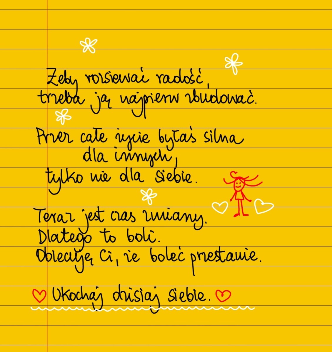 Zeby rozsiewać radość, najpierw trzeba ją w sobie zbudować.Przez całe życie byłaś silna dla innych, tylko nie dla siebie.Teraz jest czas zmiany. Dlatego to boli. Obiecuję Ci, że przestanie boleć. Ukochaj dzisiaj siebie. #żółtakartka