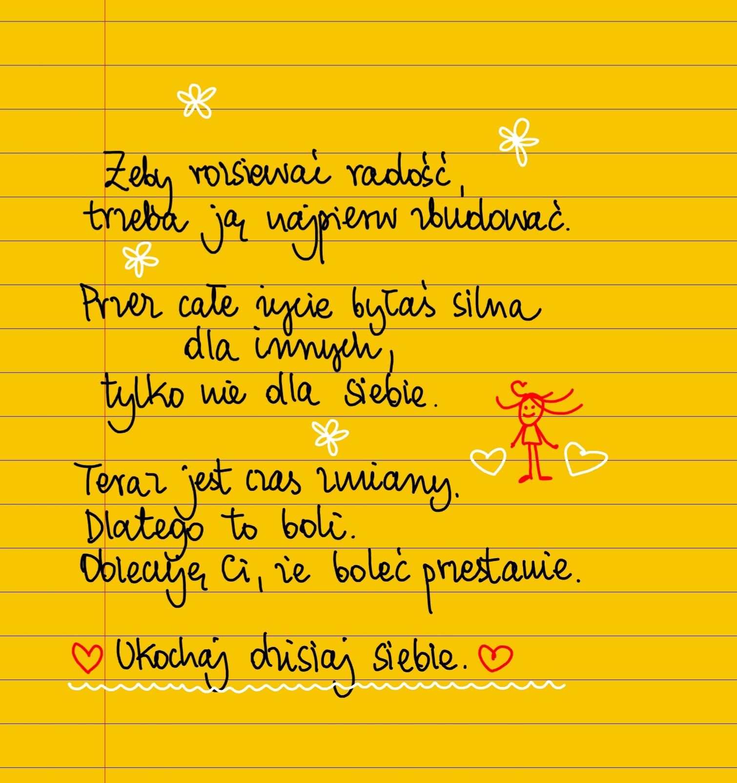 Żeby rozsiewać radość, trzeba ją najpierw zbudować. Przez całe życie byłaś silna dla innych, tylko nie dla siebie. Teraz jest czas zmiany. Dlatego to boli. Obiecuję Ci, że przestanie boleć. Ukochaj dzisiaj SIEBIE. ❤ #żółtakartka