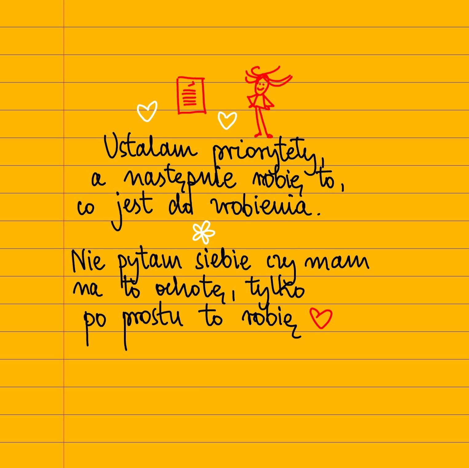 Ustalam priorytety, a następnie robię to, co jest do zrobienia. Nie pytam siebie czy mam na to ochotę, tylko po prostu to robię. #żółtakartka