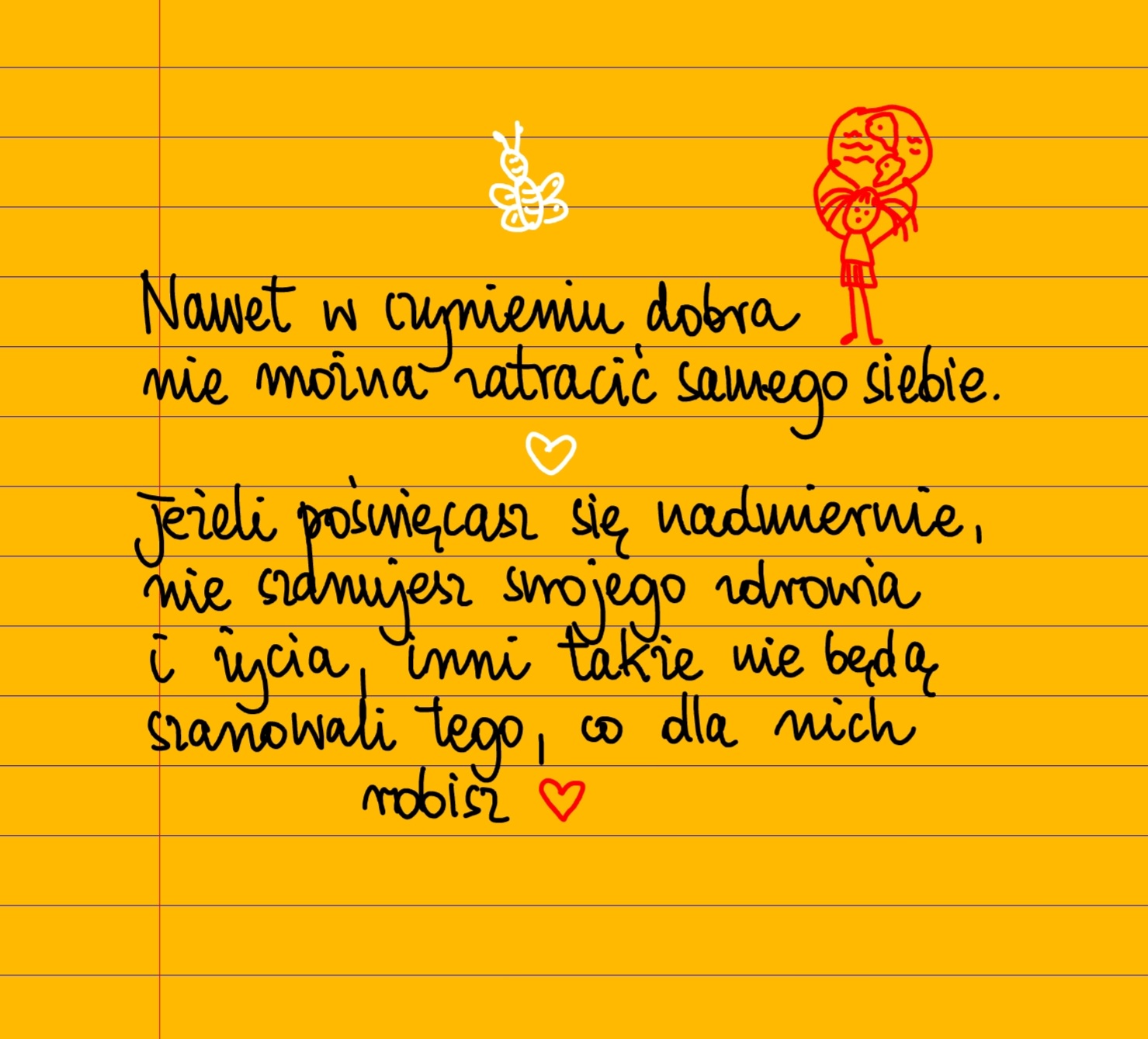 Nawet w czynieniu dobra nie można zatracić samego siebie. Jeśli poświęcasz się nadmiernie i nie szanujesz swojego zdrowia i życia, inni także nie będą szanowali tego, co dla nich robisz ❤